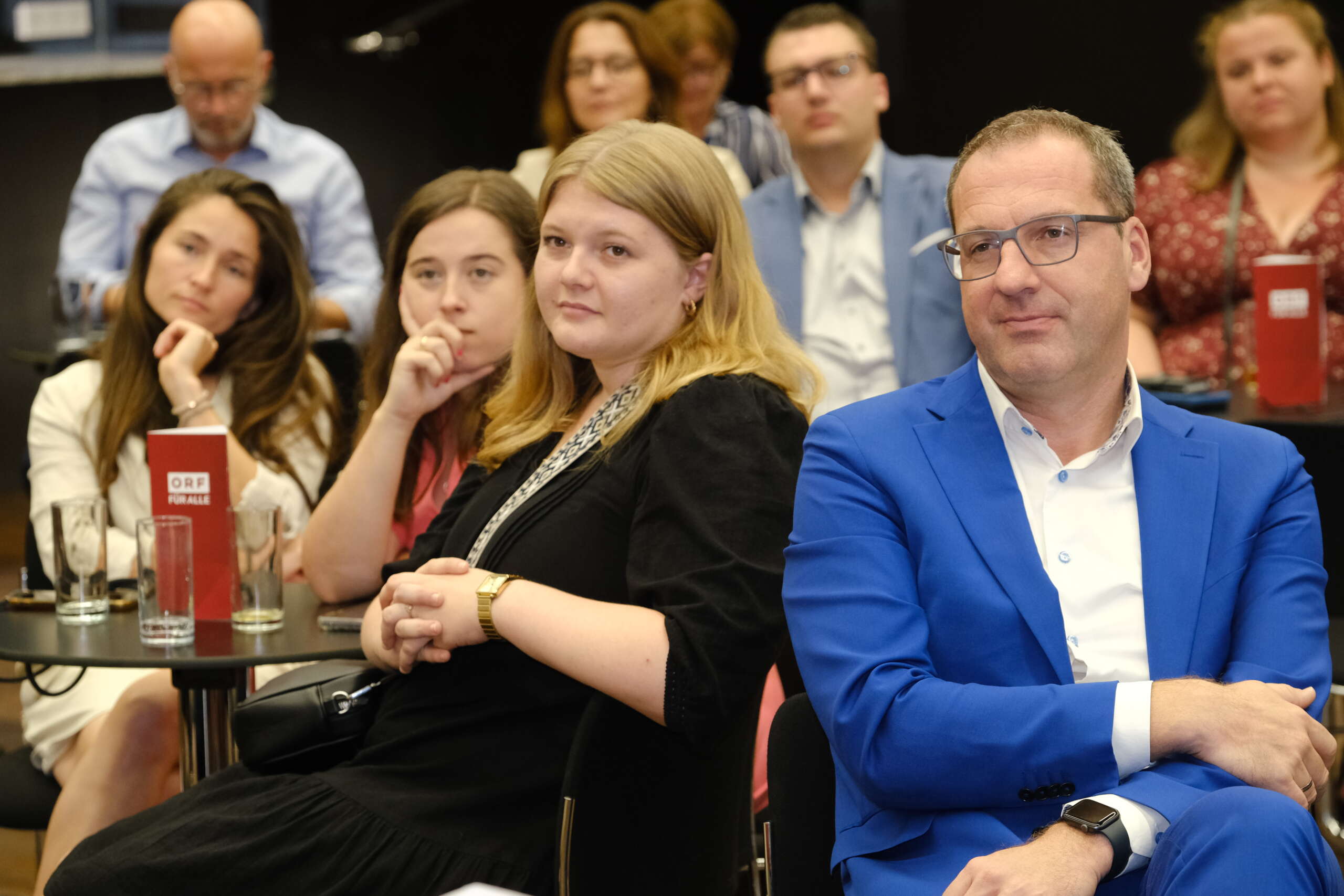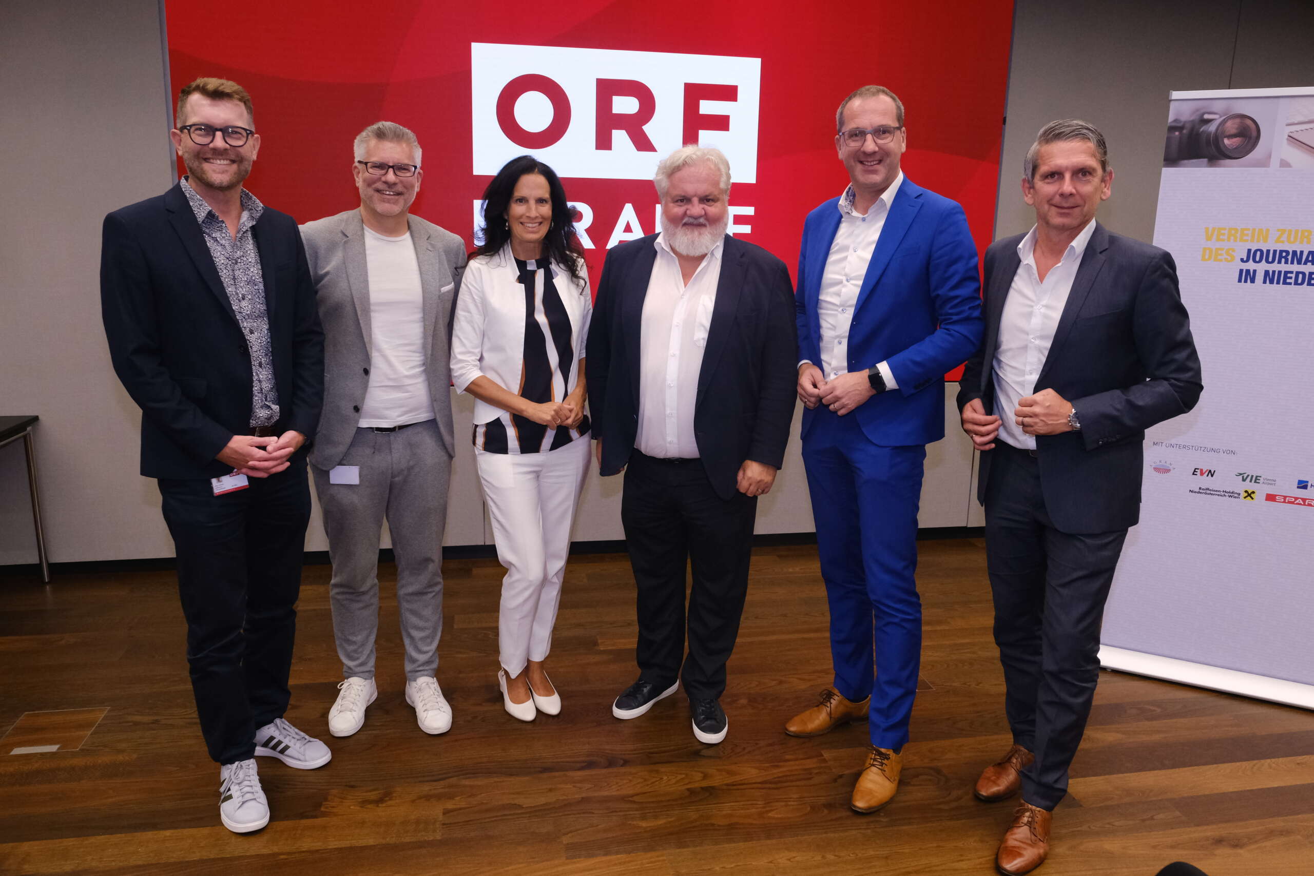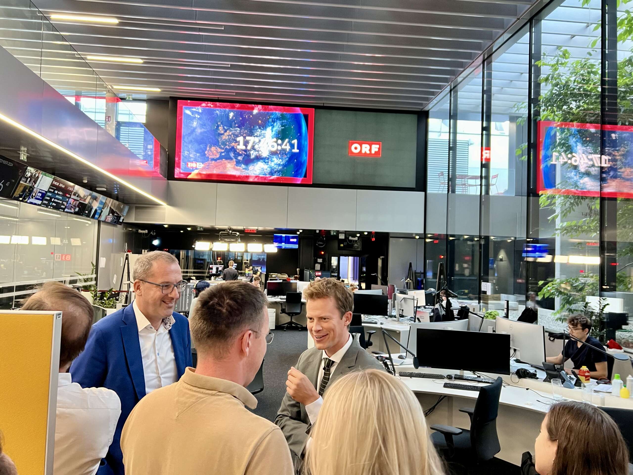 Zum Austauschen, Netzwerken und Diskutieren hat der Verein zur Förderung des Journalismus in Niederösterreich am Dienstag, den 03. September, ein „Medien Inside“ veranstaltet. Gestartet hat dieses mit einer Führung durch das ORF-Zentrum in Wien, die Teilnehmenden bekamen etwa Einblick in die Redaktion von „Ö3″ oder in die Fernseh-Studios. ORF-Moderator Tobias Pötzelsberger, bekannt durch die Nachrichtensendung „Zeit im Bild 1″, führte anschließend durch den multimedialen Newsroom des ORF-Zentrums. ORF-Chefredakteur Johannes Bruckenberger, ORF-Chefredakteur Sebastian Prokop, Ö3-Chef Michael Pauer sowie der Direktor für Technik und Digitalisierung des ORF Harald Kräuter gaben Einblicke in die aktuelle Arbeitsweise der Journalistinnen und Journalisten vor Ort.